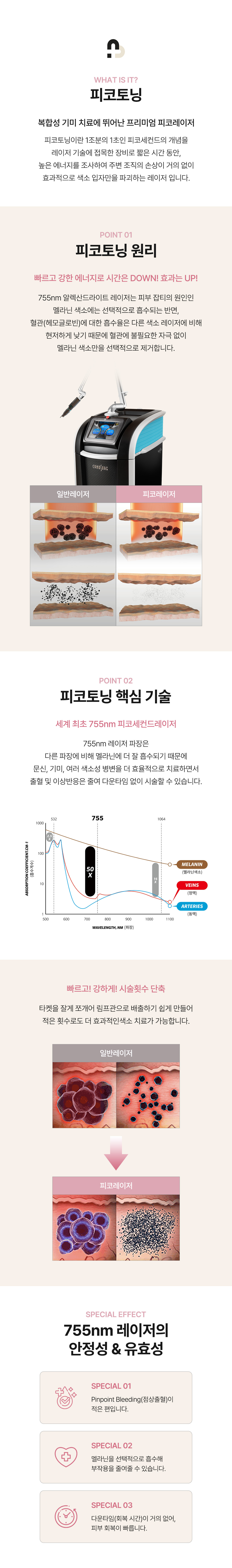 또한 일반 레이저토닝에 비해 1천배 빠른 조사력으로 일반토닝에 비해 더욱 주변조직의 손상없이 빠르고 강한 효과를 볼 수 있습니다.